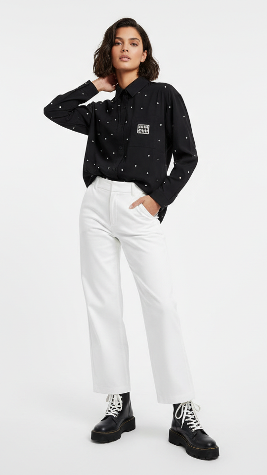 Elevate your casual chic with our Women's Black Button-Up Shirt. This stylish piece features a classic collared design and full length sleeves, offering a sophisticated silhouette. Adorned with delicate white Daimond throughout, it adds a playful yet refined touch. A detail on the chest pocket provides a unique branding element, making this shirt a statement piece. Crafted for comfort and versatility, it pairs effortlessly with both tailored trousers for a polished look or your favorite denim for an elevated everyday ensemble. Perfect for the modern woman seeking a blend of classic style and contemporary flair.