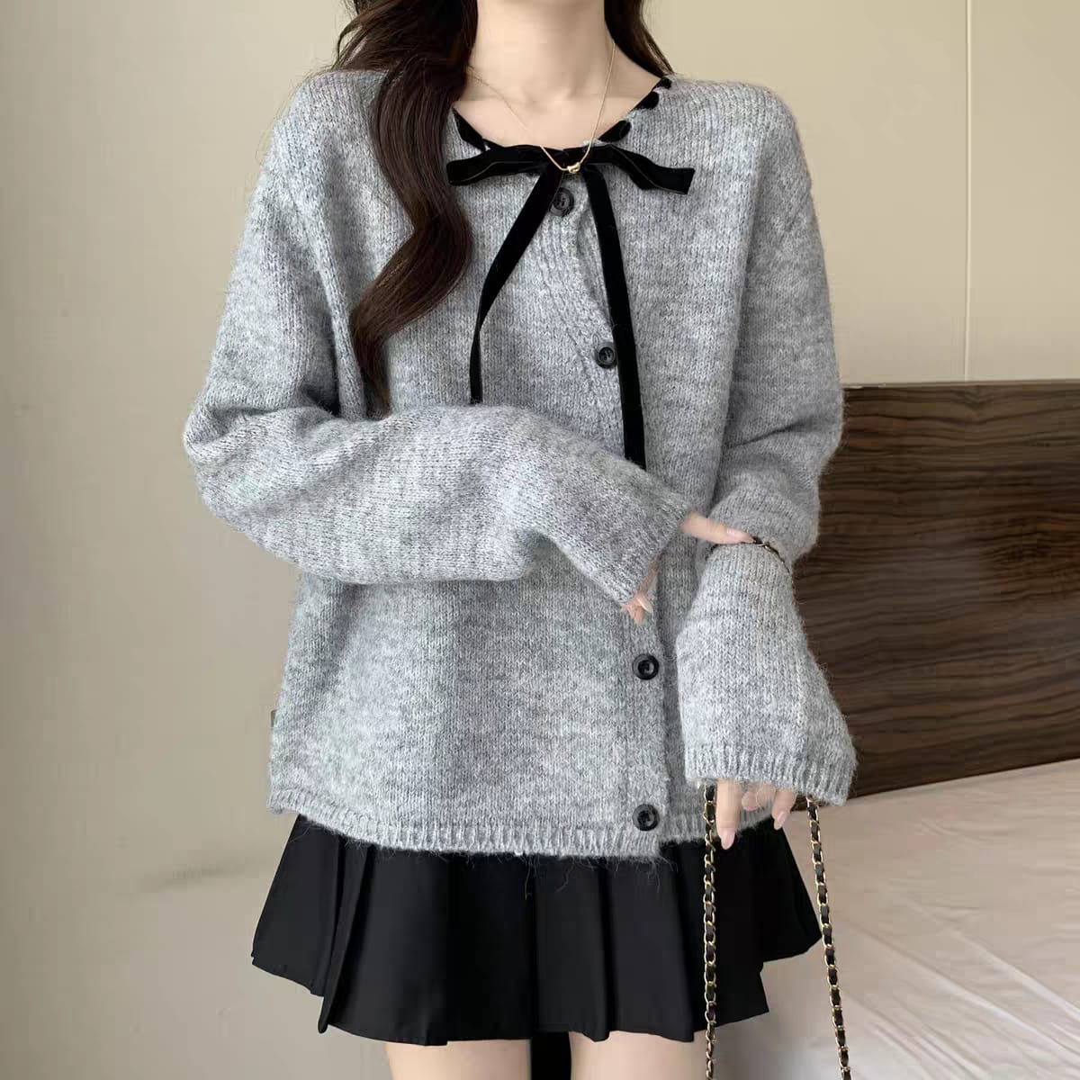 This image displays a Grey knit cardigan with a prominent black velvet ribbon tie closure at the neck. The cardigan features a soft, textured knit fabric, a crew neckline, long sleeves with ribbed cuffs, and button details down the front. It presents a cozy, elegant, and versatile style, often associated with vintage or Korean fashion aesthetics, suitable for layering in fall and winter.