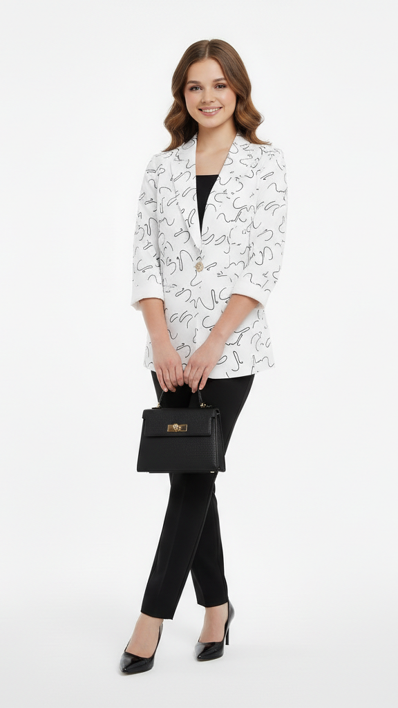 Womens White Printed Fancy Blazer  Elevate your smart-casual and formal wardrobe with this elegant women’s white printed blazer. Designed with a classic notch lapel and...