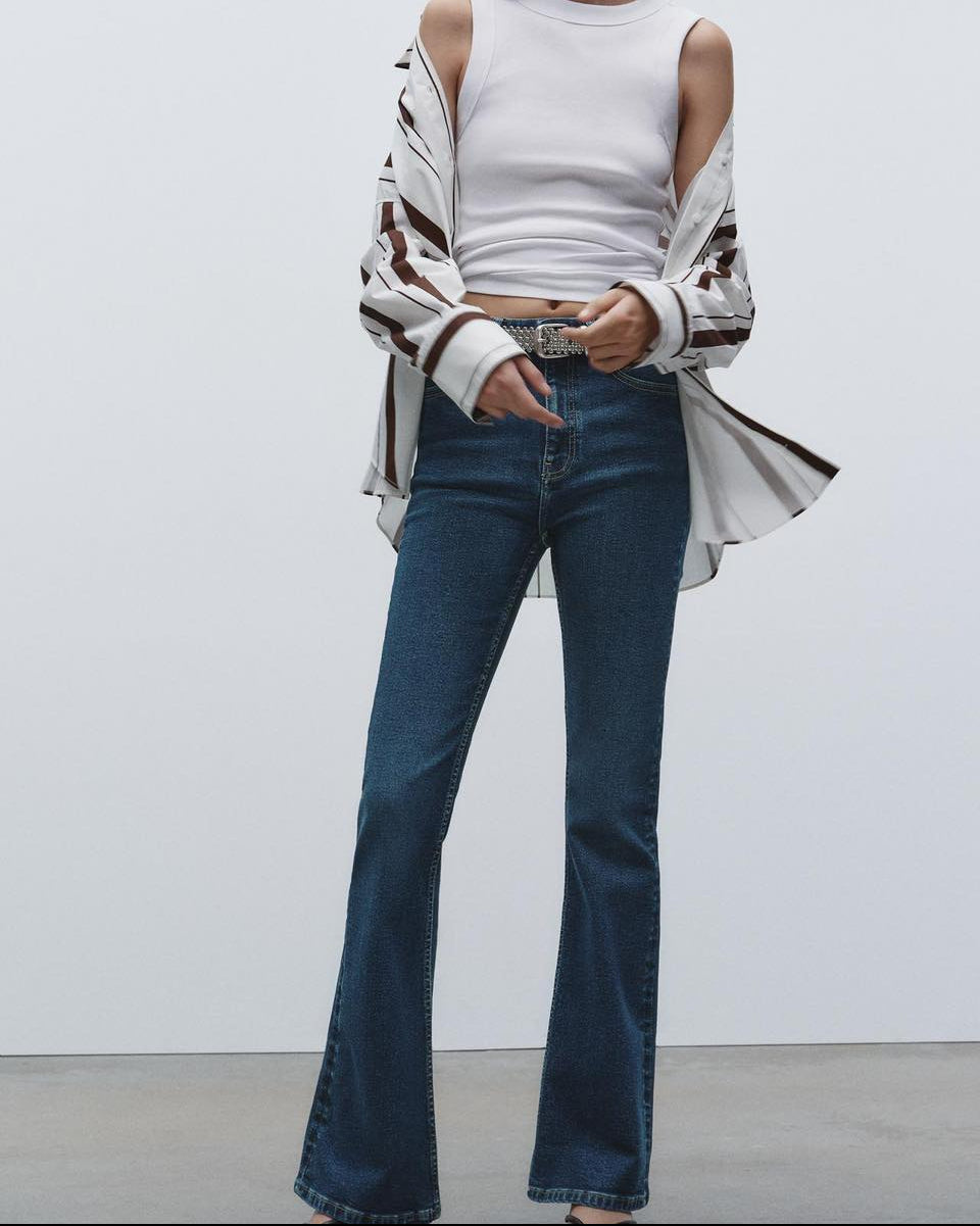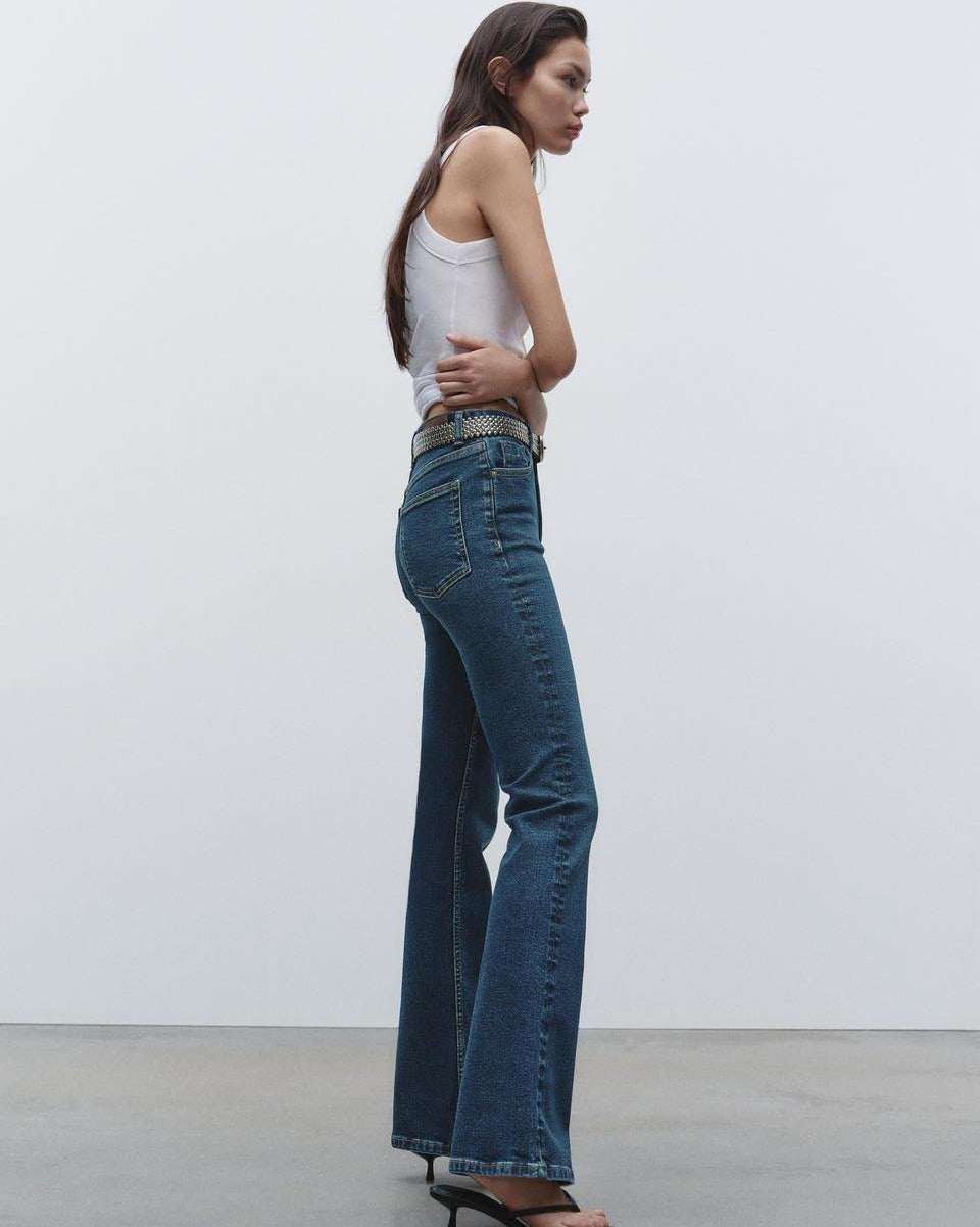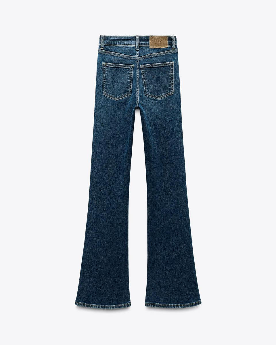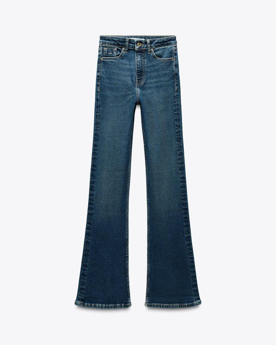 High-waisted jeans with belt loops and five pockets. Flare hem. Front metal button closure.