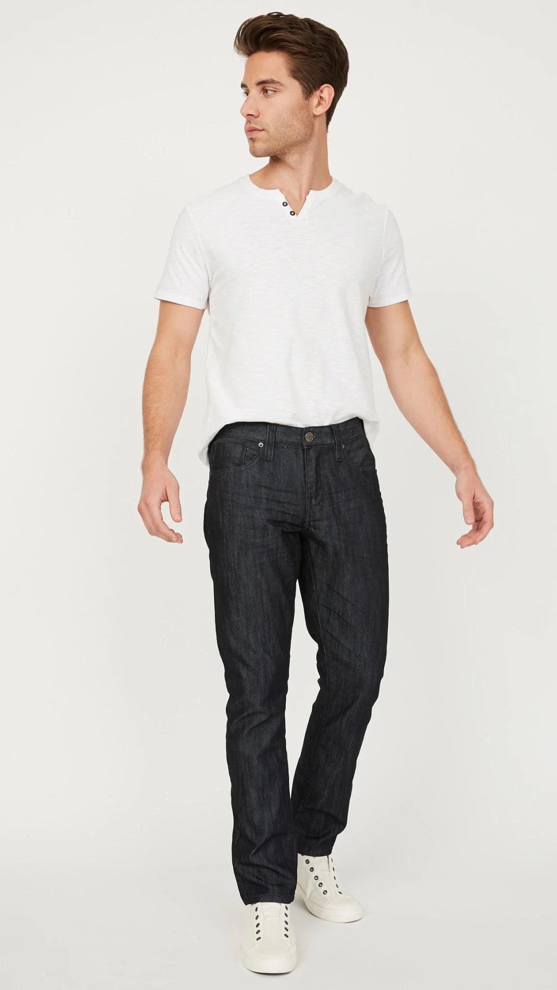 درمیانے درجے کی جینز جس میں گھٹنے کے نیچے ایک پتلی فٹ اور ٹیپرڈ ٹانگ موجود ہے۔ گہرے انڈگو واش کو نرم محسوس کرنے کے لیے کلی کیا جاتا ہے۔