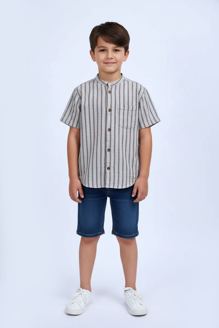 کاٹن شرٹ کالر کے ساتھ بنے ہوئے سوتی کپڑے میں قمیض، آگے بٹن اور پیچھے دو تہوں والا جوا۔ کف پر بٹنوں کے ساتھ لمبی...