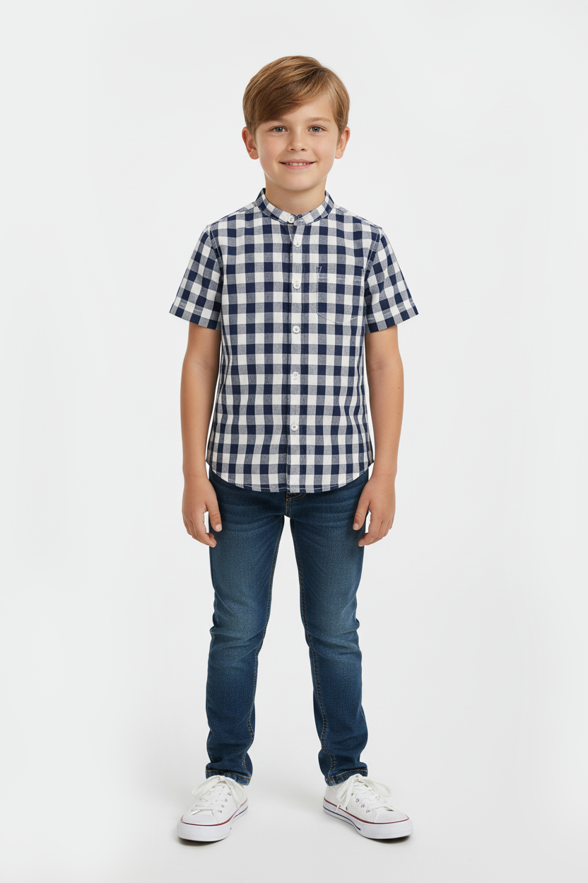 بنی سوتی قمیض۔ مینڈارن کالر، سینے کی جیب اور سامنے والے بٹن کے ساتھ مختصر بازو والا ماڈل۔ گول ہیم۔