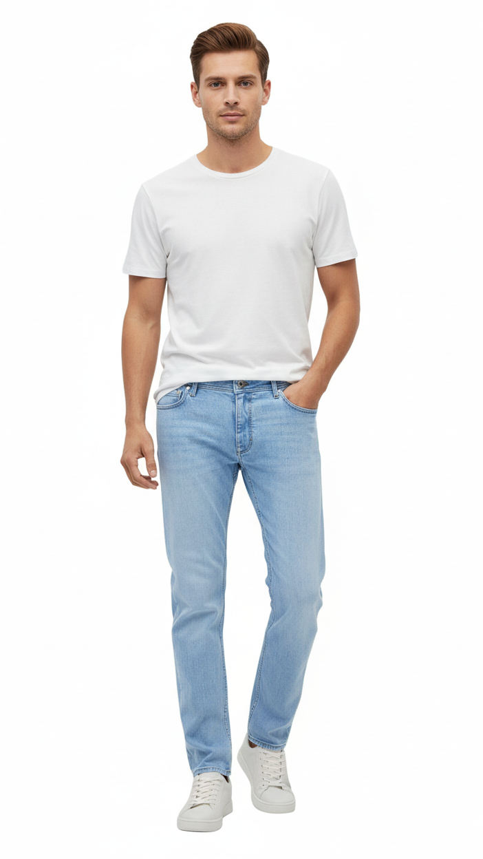 بنیادی مجموعہ۔ سلم فٹ۔ پائیدار سوتی مرکب تانے بانے۔ سیاہ لوپس۔ دو طرفہ جیبیں۔ سکے کی جیب۔ پشت پر دو پیچ جیبیں۔ زپ اور ایک بٹن باندھنا۔ ماڈل 180 سینٹی میٹر لمبا ہے اور اس نے 42 سائز کا ڈینم جینز پہنا ہوا ہے۔