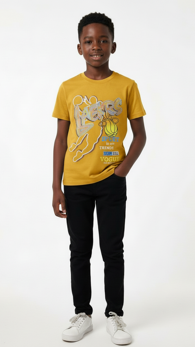 Elevate his casual wardrobe with this stylish and comfortable boys' Mustard graphic print t-shirt. Crafted from soft, breathable cotton, this short-sleeve tee ensures all-day comfort for active kids. The front features an eye-catching, multi-textured graphic design with a dynamic basketball motif and playful text elements that read "SPORT is not TRENDY," "SUP ER2.," and "VOGUE Slam Dunk Hand." Perfect for everyday wear, school, or weekend adventures, this versatile t-shirt pairs effortlessly with jeans, shorts, or joggers, adding a cool, sporty touch to any outfit.