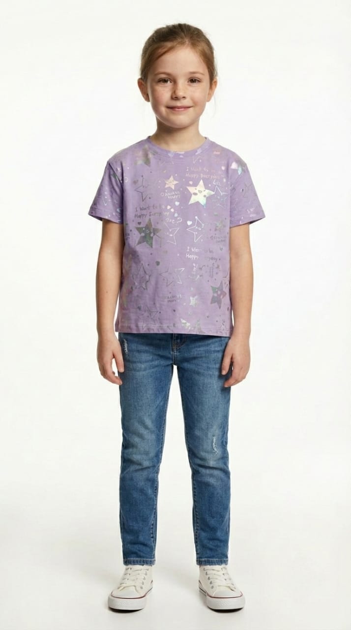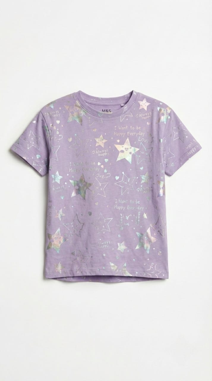 Let her shine with our delightful Girls' "Happy Everyday" Iridescent Star Print Short Sleeve T-Shirt. This charming lavender tee is crafted from a soft, breathable cotton blend, ensuring all-day comfort for active youngsters. Featuring a playful array of iridescent star prints that shimmer with every move, along with inspiring "I Want to be Happy Everyday" and "Always Happy" typography, this top is designed to spread joy.