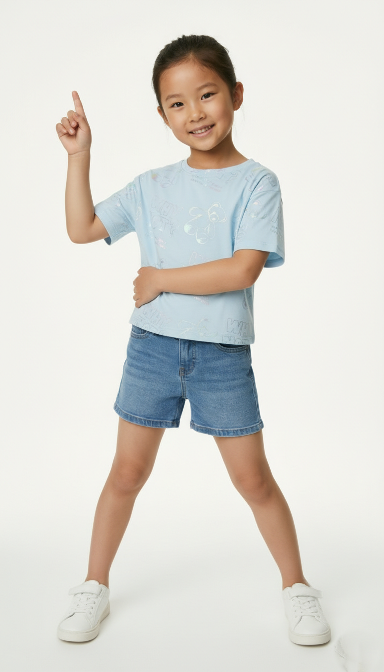 Introduce a splash of fun and comfort to her wardrobe with our Girls' Metallic Teddy Bear "Why Not?" T-Shirt! This charming tee combines ultimate comfort with a playful design, featuring an all-over metallic print of cute teddy bears and an inspiring "Why Not?" message. Made from 100% soft, breathable cotton, it's designed for all-day wear, keeping her cool and comfortable. The fashionable cropped silhouette is versatile and easy to style, making it a go-to piece for her casual outfits. A perfect blend of comfort, cuteness, and subtle sparkle!