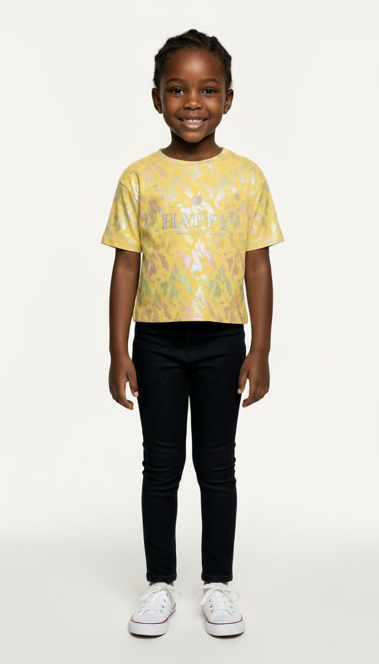 M&S Girls' Trendy Girls' Mustard Crop Top - "HAPPY" Tee with Shimmer & Patterned Texture Description:Elevate her casual style with this Trendy Girls' Mustard Crop...