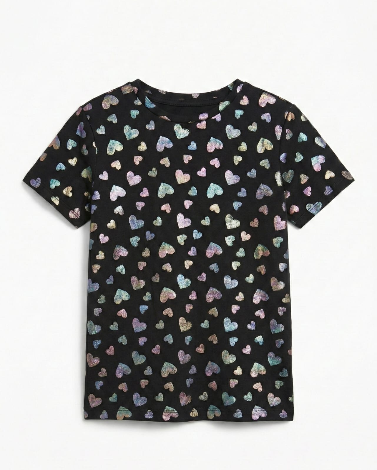 Bring a touch of playful sparkle to her everyday wardrobe with this delightful Girls' Shimmer Heart Print Short Sleeve T-Shirt. Crafted from soft, comfortable fabric, this tee features an all-over print of iridescent hearts that catch the light with every move. The classic crew neck and short sleeve design make it perfect for warm weather or layering under jackets and cardigans. Ideal for casual outings, school, or just relaxing at home, this charming t-shirt is sure to become a favorite.