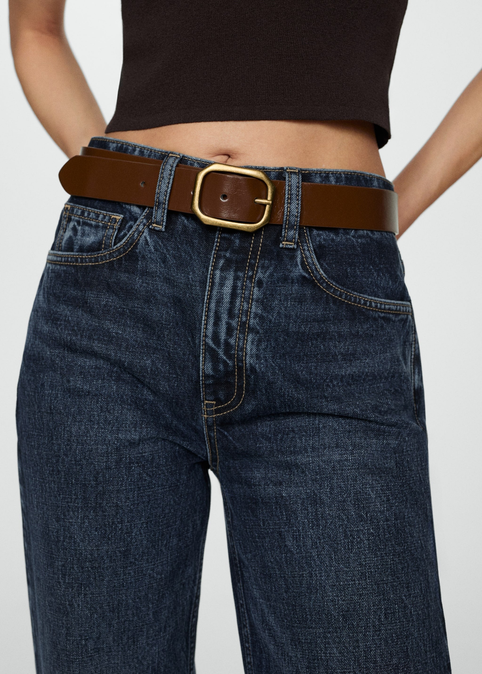 ڈینم طرز کا سوتی کپڑا۔ اونچی کمر۔ لمبا ڈیزائن۔ سیدھا ڈیزائن۔ پانچ جیبیں۔ بیلٹ لوپس۔ انسیم 82 سینٹی میٹر۔ سامنے کی زپ اور بٹن بند کرنا۔