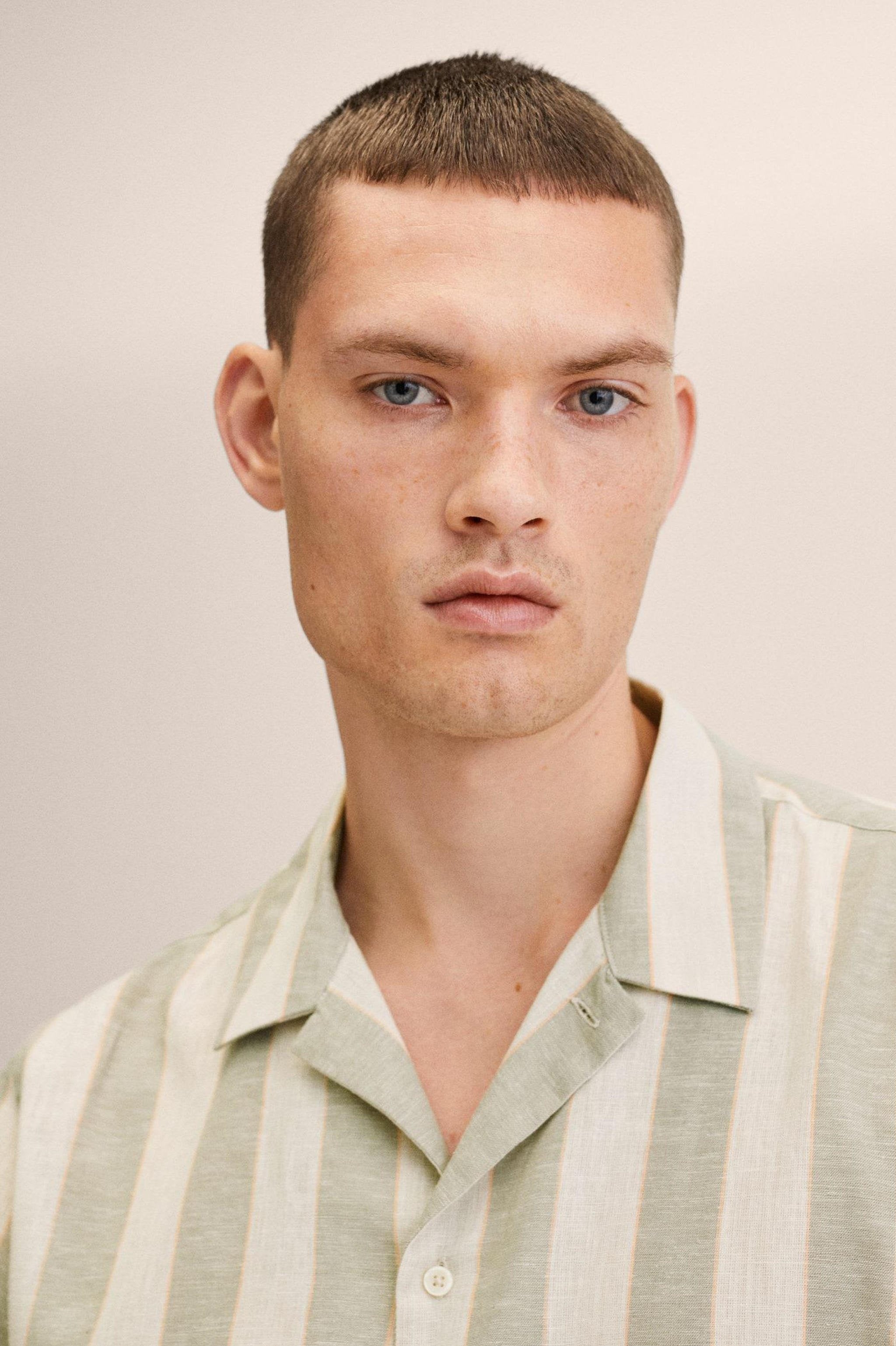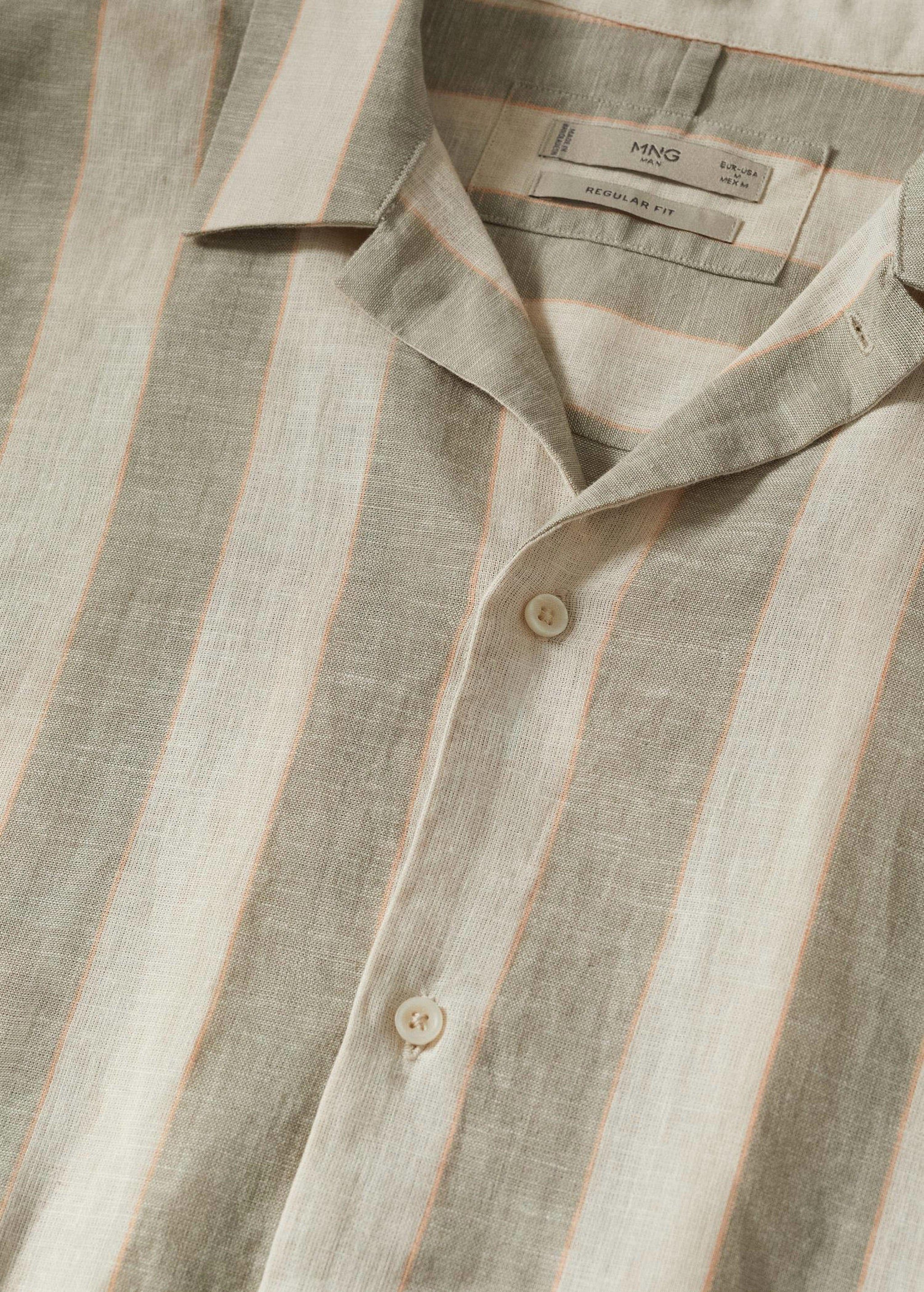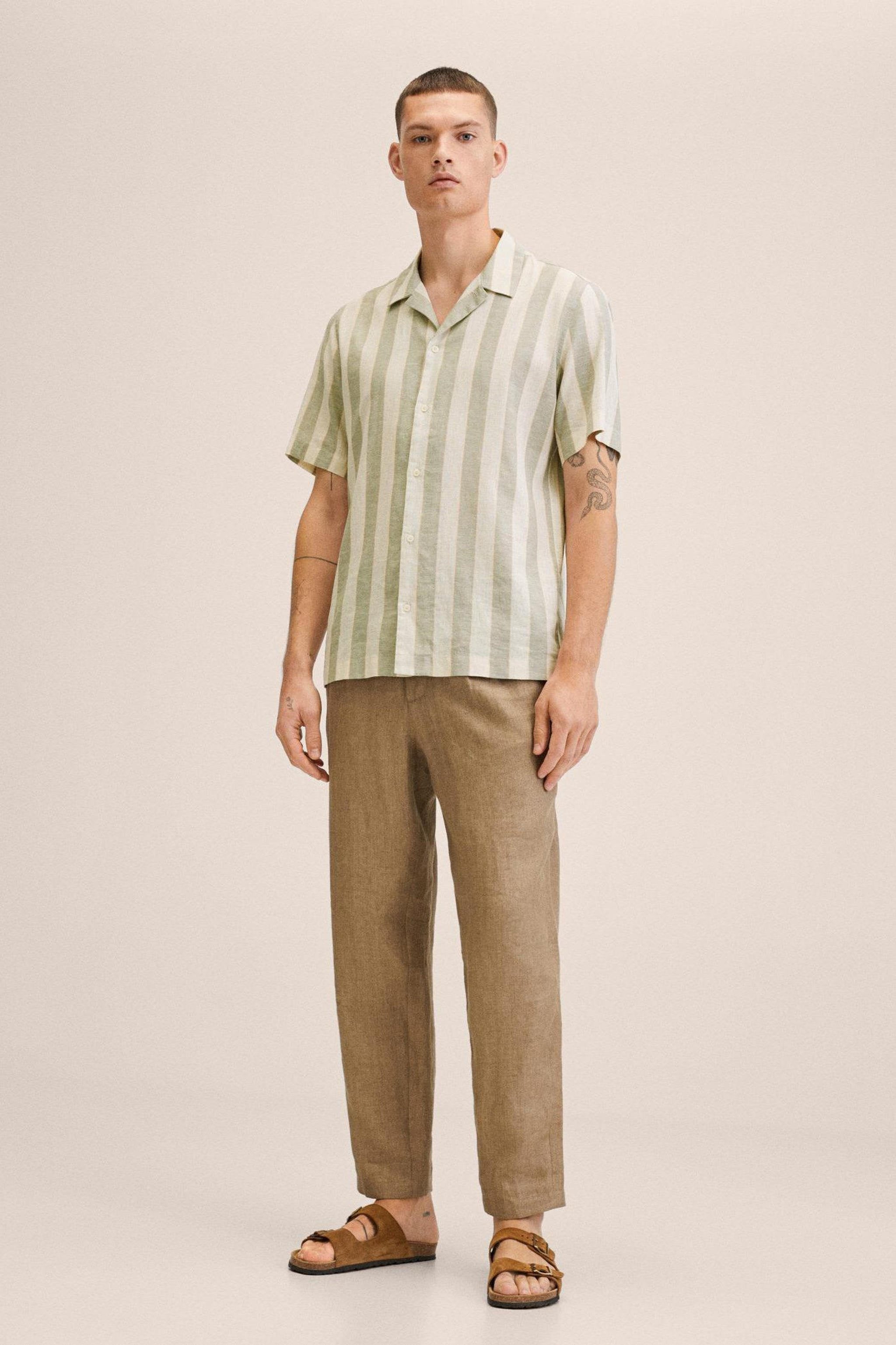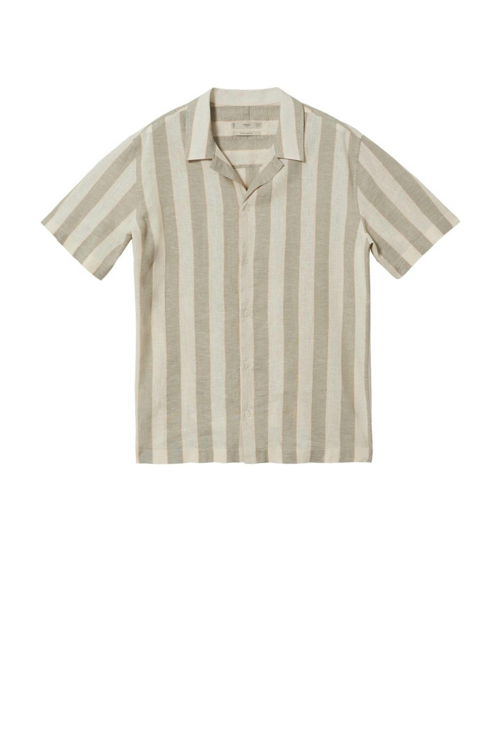 مینگو مین کی یہ باقاعدہ فٹ مردوں کی قمیض لینن سے بنی ہے (قدرتی طور پر زیادہ پائیدار) اور دھاری دار ہے۔ اس میں لیپل کالر اور چھوٹی بازو شامل ہیں۔ قمیض کا بٹن بند ہے۔
