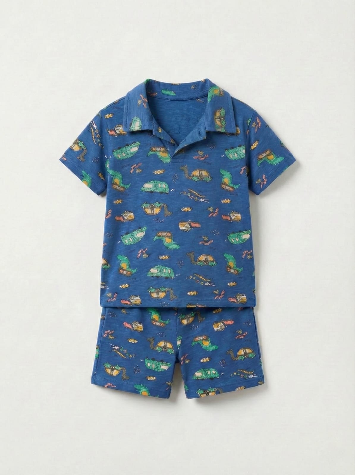 Introduce a playful touch to your little one's wardrobe with our adorable Toddler Boys' Dino & Vehicle Print Polo Shirt and Shorts Set. Crafted from soft, breathable cotton, this two-piece outfit ensures all-day comfort for active adventures. The vibrant blue polo shirt features a fun all-over print of friendly dinosaurs and various vehicles, adding a whimsical charm. Designed with a classic collar and short sleeves, it offers a smart yet casual look. The coordinating pull-on shorts complete the ensemble, providing an easy and comfortable fit. Perfect for casual outings, playdates, or everyday wear, this charming set combines comfort, style, and durability for your growing boy.