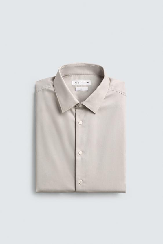 Slim fit shirt made from cotton fabric. Features a spread collar and long sleeve with buttoned cuffs. Button-up front fastening.