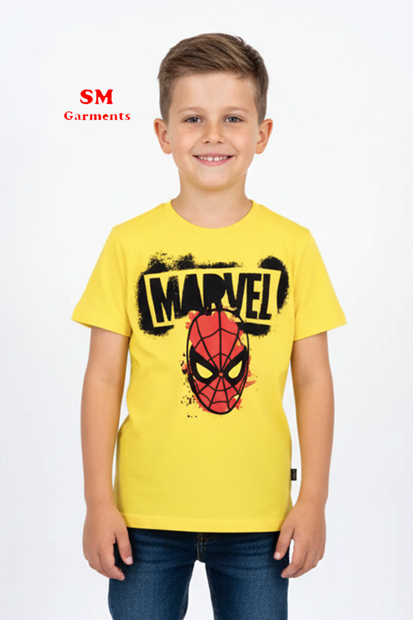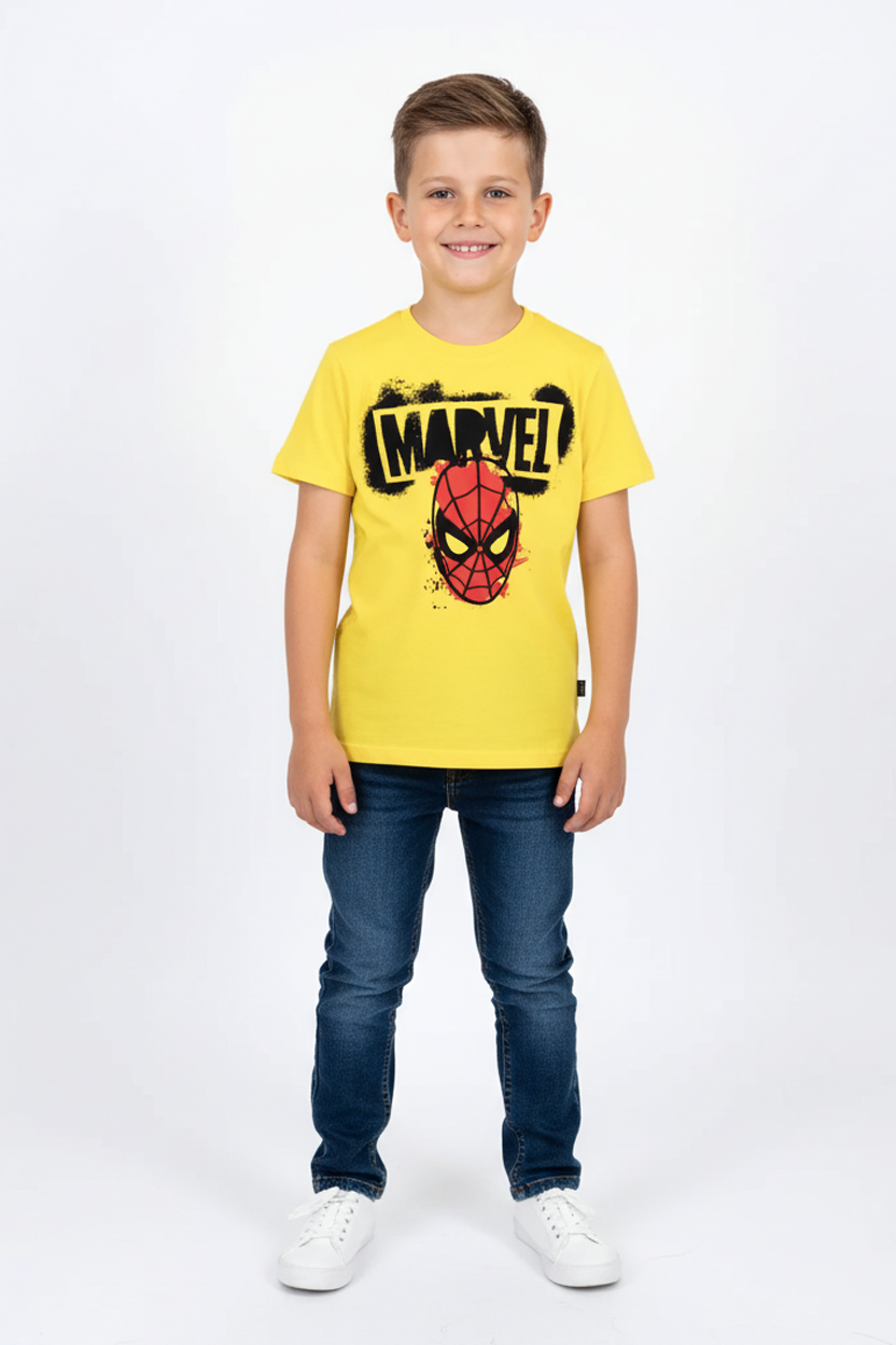 پائیدار کاٹن فرنٹ اور بیک اسپائیڈر مین پرنٹ کے ساتھ اسپائیڈر مین ٹی شرٹ۔ پسلی ہوئی گردن۔