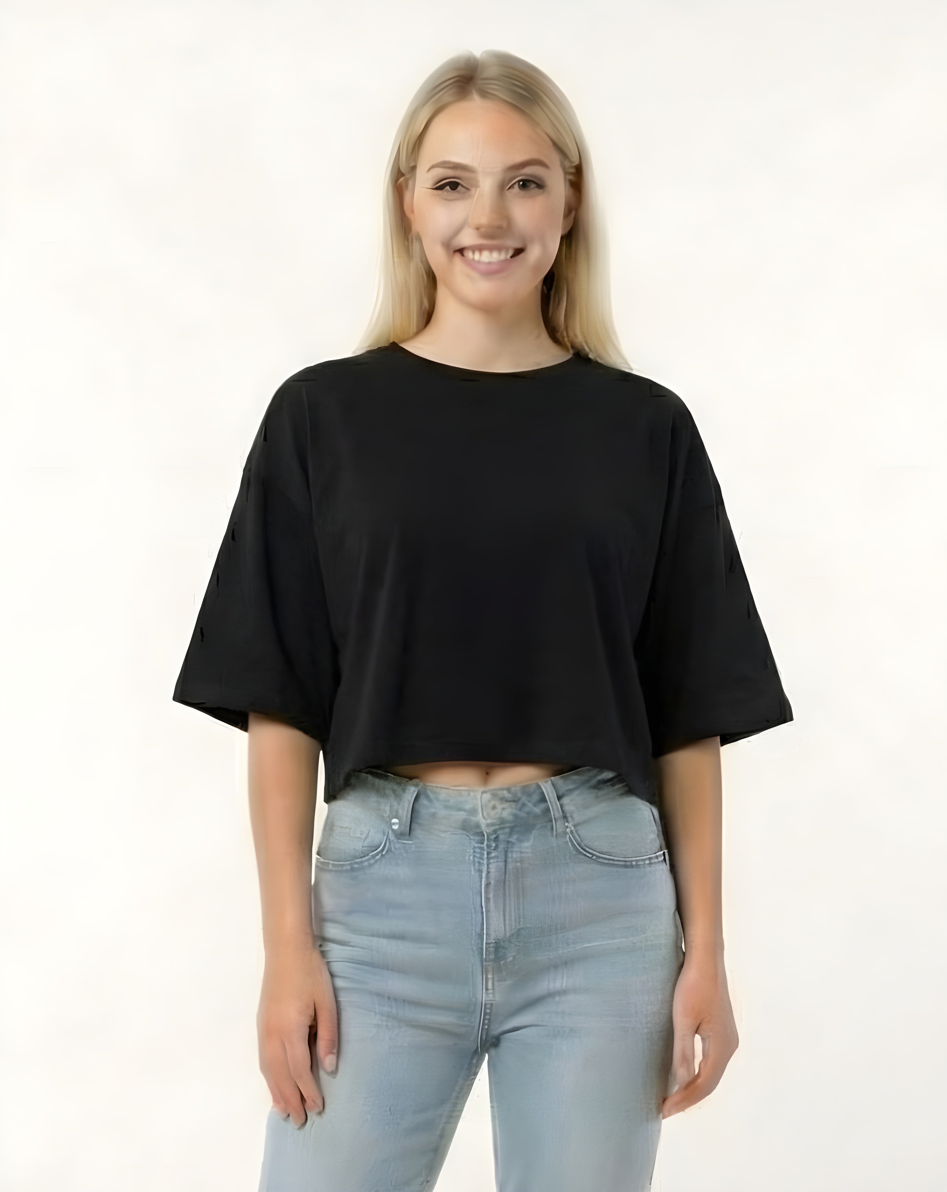 کشتی کی گردن اور چھوٹی بازوؤں کے ساتھ بڑی فٹ ٹی شرٹ۔ گرے ہوئے کندھوں کے ساتھ کٹا ہوا ڈیزائن اور سامنے پر روڈیو پرنٹ۔