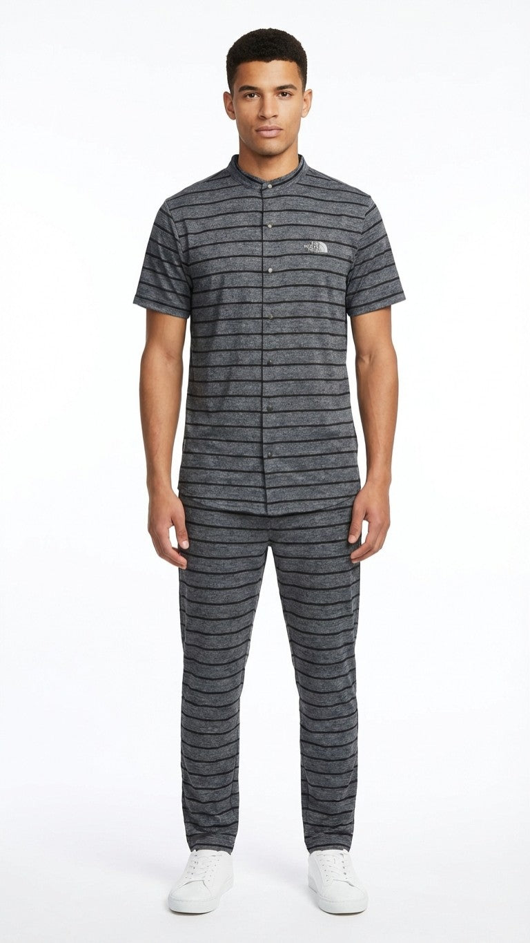 Featuring a sleek horizontal stripe design, a minimalist button-front placket, and a refined short-sleeve silhouette, this shirt delivers a perfect balance of sporty function and casual style. The lightweight, breathable construction ensures ease of movement, making it ideal for outdoor activities, travel, workouts, or smart-casual everyday wear.