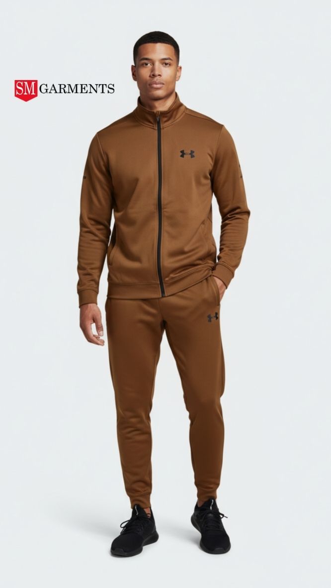مردوں کے اس ٹریک سوٹ میں سیاہ لہجوں کے ساتھ ایک بھرپور بھورا رنگ ہے، جس میں جیکٹ پر فل زپ فرنٹ اور جیکٹ اور پتلون دونوں پر ٹھیک ٹھیک برانڈنگ شامل ہے۔ جیکٹ میں اسٹینڈ اپ کالر اور لمبی آستینیں ہیں، جبکہ میچنگ پتلون ٹخنوں میں کف ہے۔ یہ آرام دہ اور سجیلا سیٹ ایتھلیٹک سرگرمیوں، لاؤنج، یا آرام دہ لباس کے لیے بہترین ہے۔